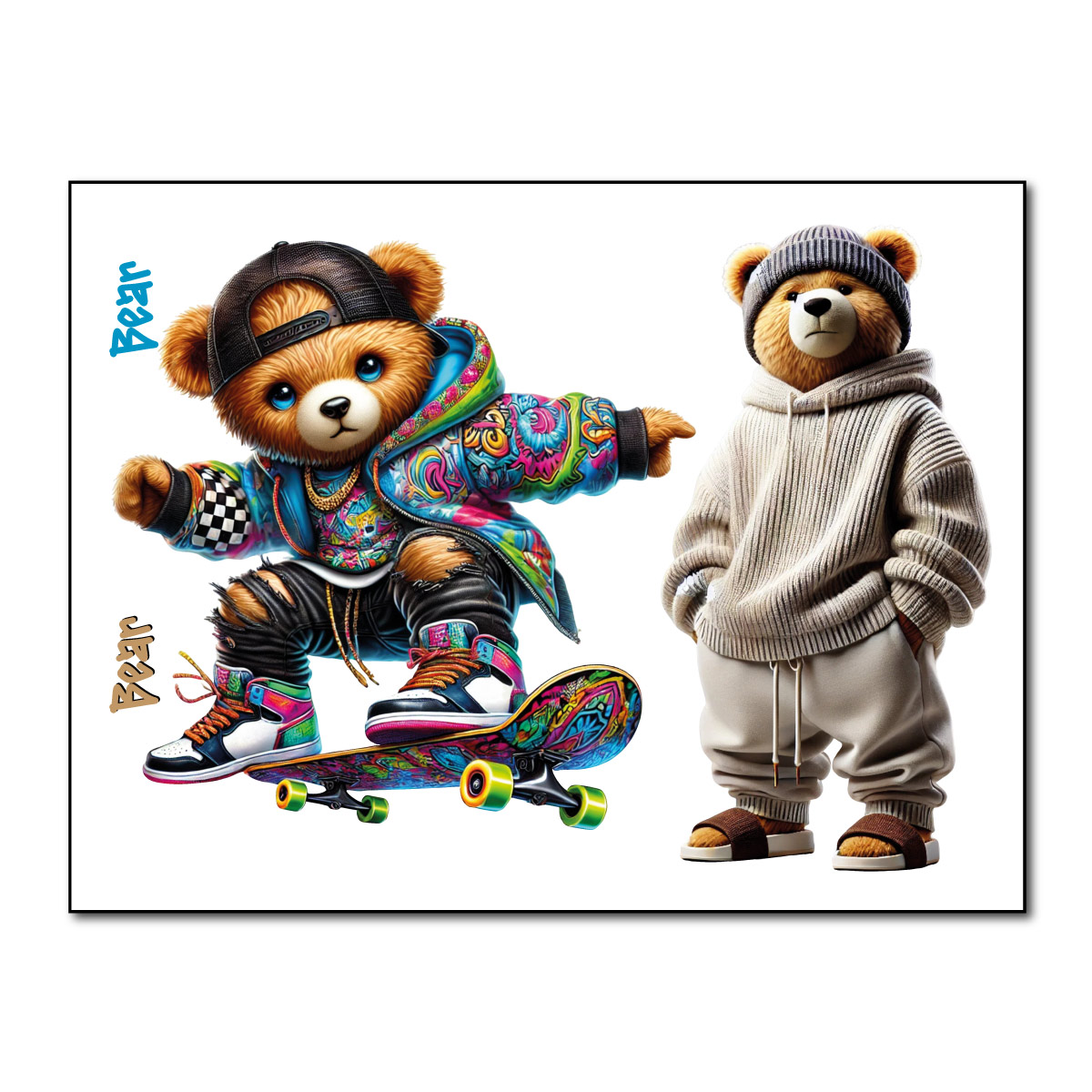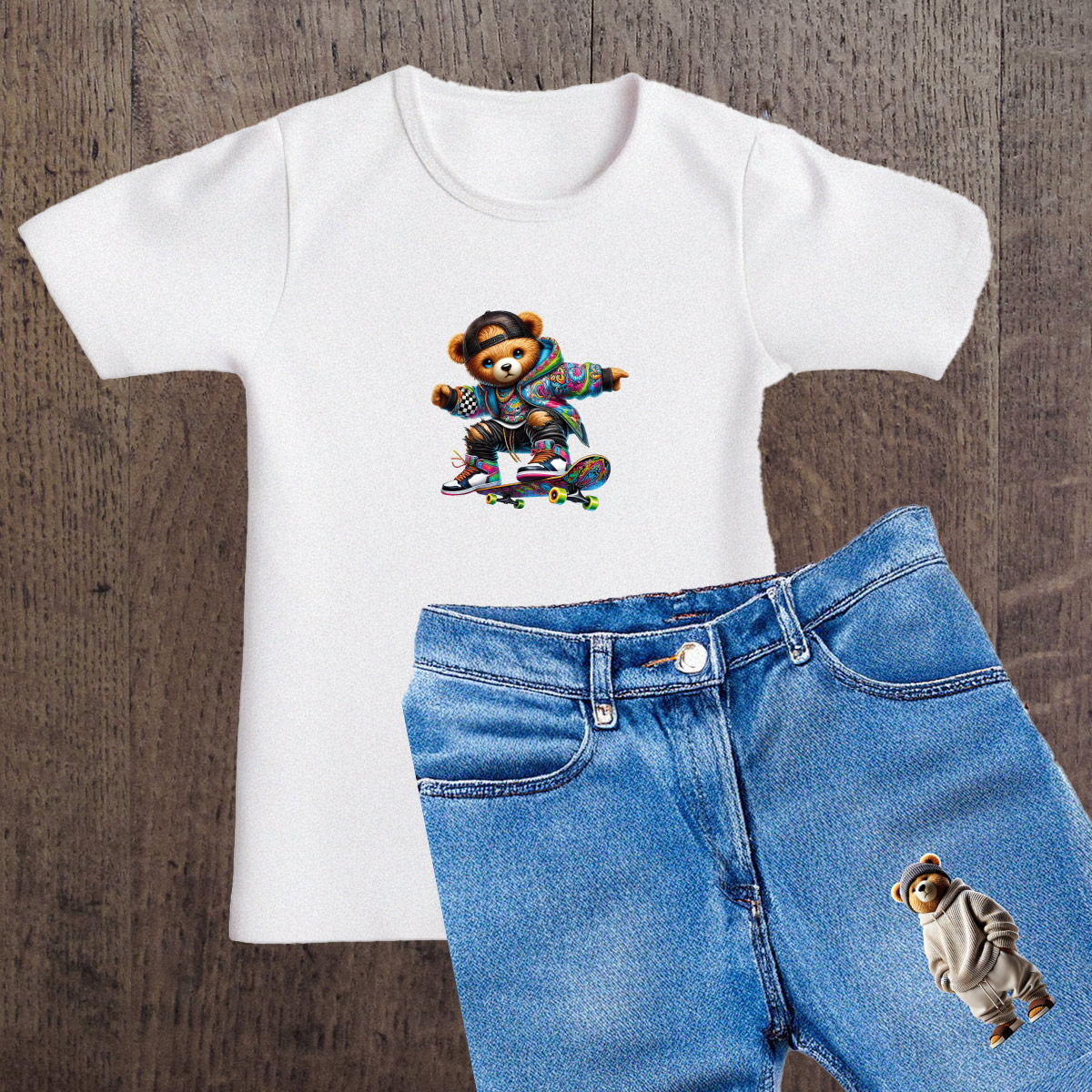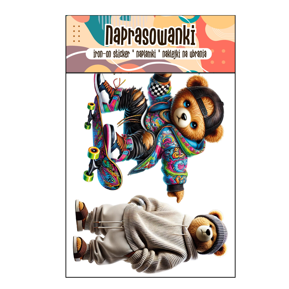 Naprasowanki, Naplamki, Termo Naklejki na Ubrania DTF - 2 Misie zestaw z Deskorolką