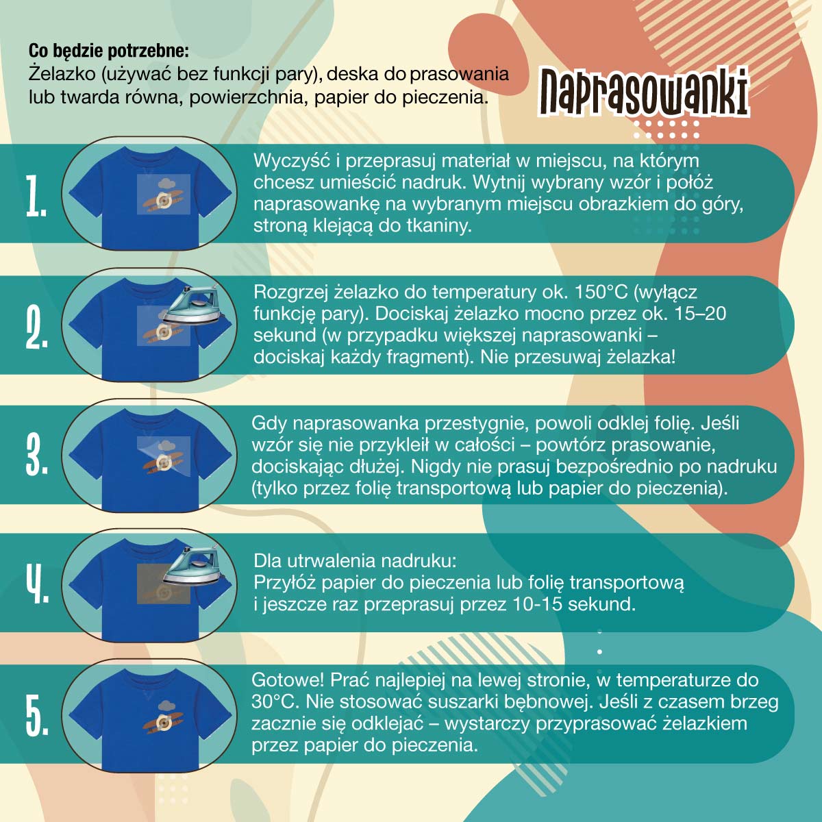 Uwaga: Używać zgodnie z przeznaczeniem. Stosować tylko pod nadzorem osoby dorosłej. Stosowanie żelazka może powodować oparzenia. Małe elementy, możliwość zakrztuszenia. Nie stosować na skórę. Zachowaj ostrożność przy zdejmowaniu folii transportowej – odczekaj aż ostygnie i rób to powoli, żeby uniknąć uszkodzeń nadruku.